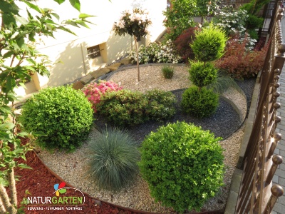 Ying und Yang haben wir öfter schon als Gestaltungsidee zugrunde gelegt. Dieser Vorgarten ist vom Besitzer verwirklicht und einer unserer Mitarbeiter hat den riesigen Wacholder geschnitten. Beides bildet eine perfekte Einheit.