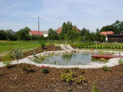 Naturteiche werden erst durch entsprechendes Material und eine passende Bepflanzung zu solchen Erlebnisräumen. Ein Steg lädt zum Beobachten ein - nicht nur für Kinder !